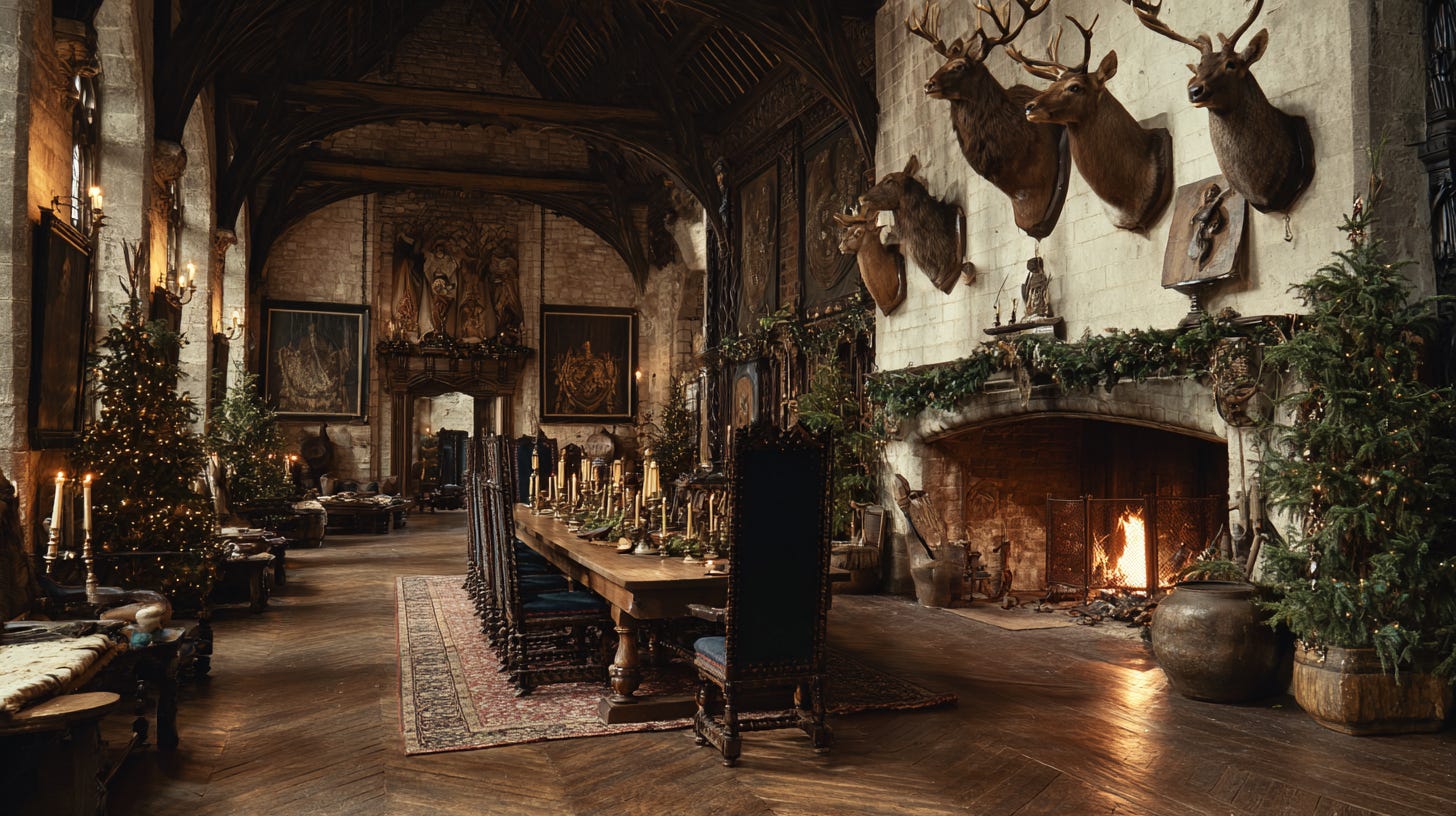 They emerged into a dining room dominated by a massive wooden table long enough to seat two dozen guests. High-backed chairs bore carved coats of arms. Above the fireplace, a stag’s head wore Christmas garlands tangled in its antlers. To her left, a bear’s head seemed to explode from the wall, jaws frozen in a roar. To her right, ancient weapons gleamed and her historian’s fingers itched to examine them. A stepladder stood beneath, draped with holly. The household was mid-decoration.