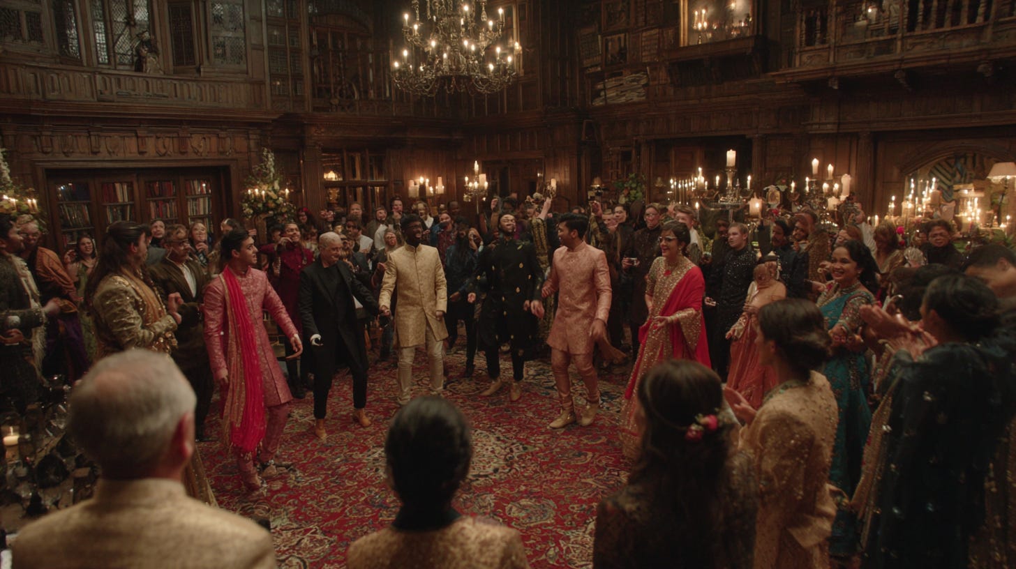 A bagpiper stepped in front of the orchestra and launched into a lively, rhythmic tune. The noble lords and ladies began dancing the ceilidh, jumping comically in their formal attire. Guests joined in. The elder bowed solemnly to Clara.